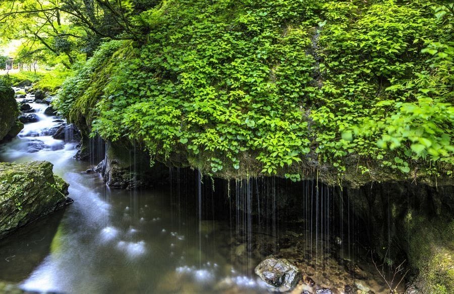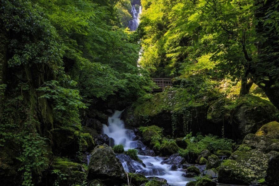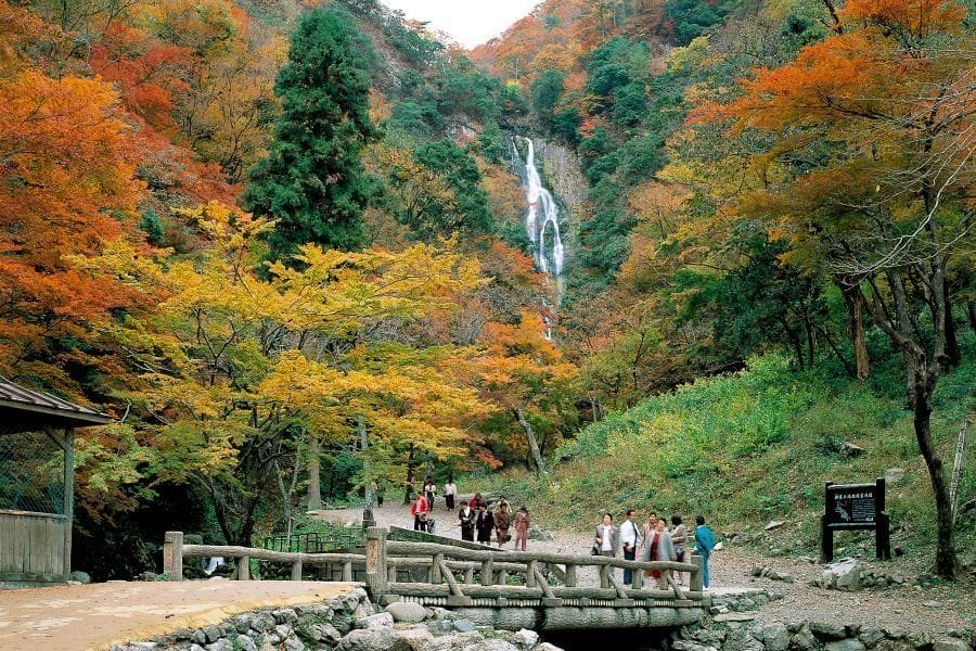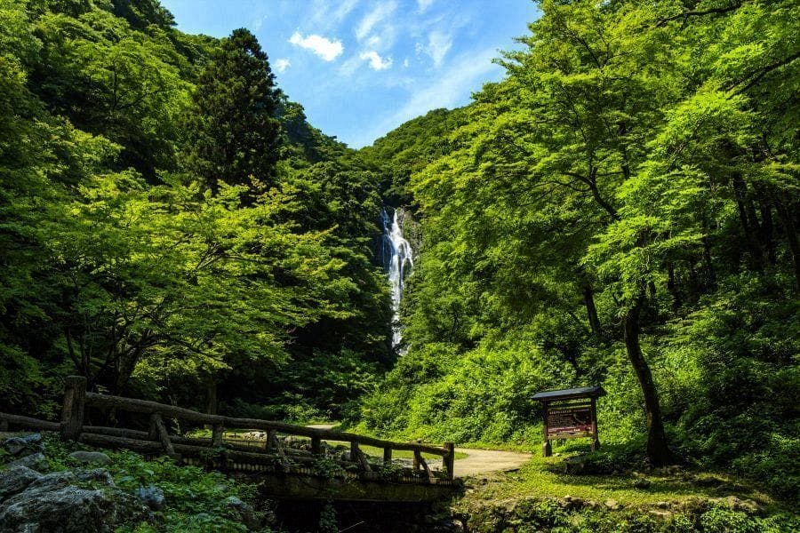 The waterfall is one of the largest in western Japan, with a 110-meter drop. It’s a stepped waterfall with a smaller drop in the upper part. However, the upper part can only be seen from the top. The waterfall is particularly beautiful in autumn. There’s a cave nearby with stalactites called Oni-no-ana.