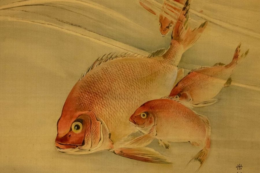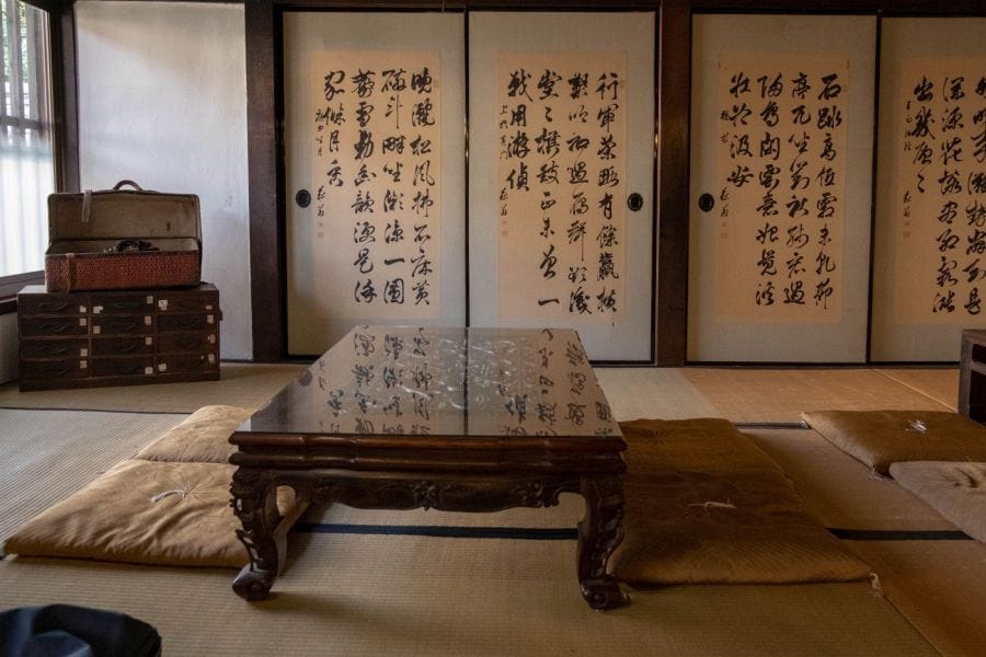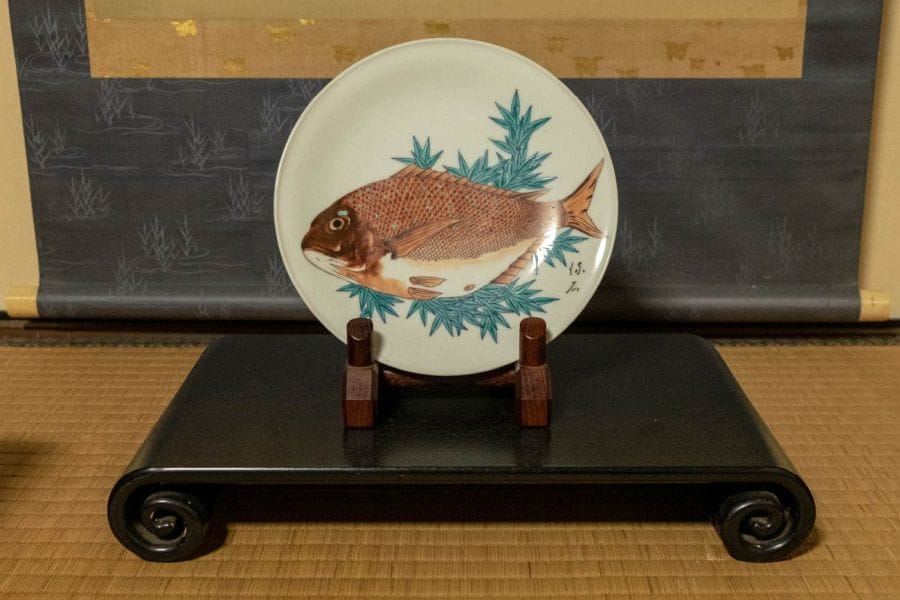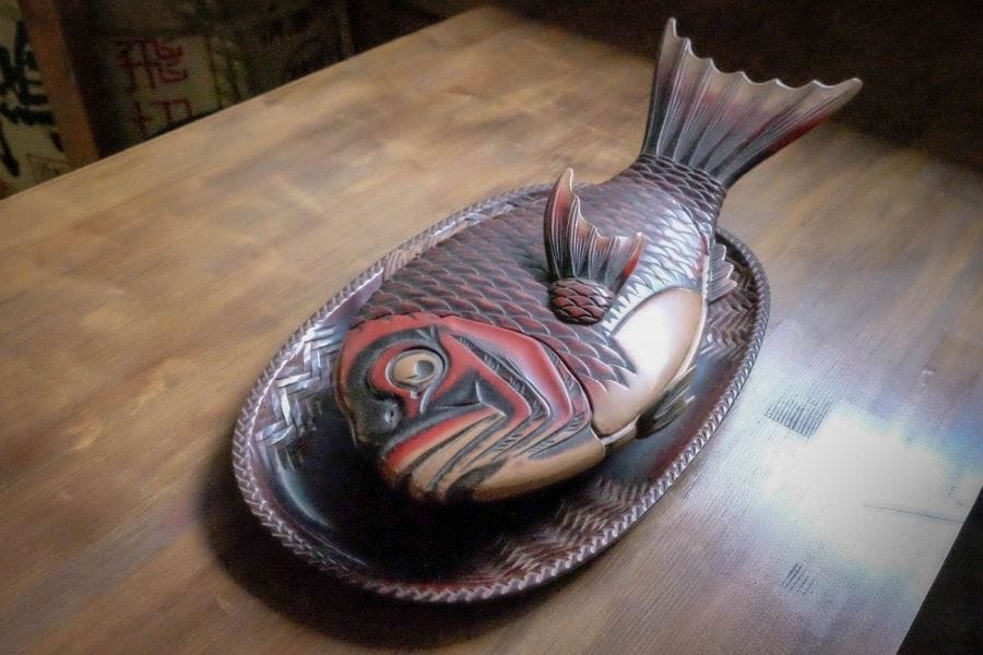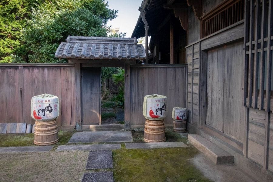 Matsuura-san took us around some of the old brewery buildings. In the residential area, there are many items with a red snapper theme, in keeping with the brewery’s ‘tai’ brand. There’s a lump of wood that looks a bit like a fish, a chopping board used to prepare a snapper when the Emperor Taishō visited Naruto, and a beautifully carved wooden fish dish with a lid. The rooms are furnished and decorated with a wealth of elegant and valuable furniture and artworks.