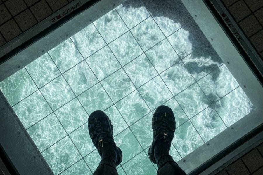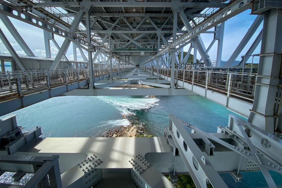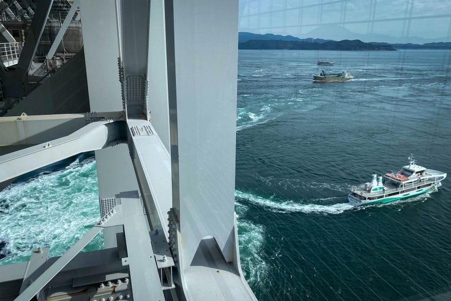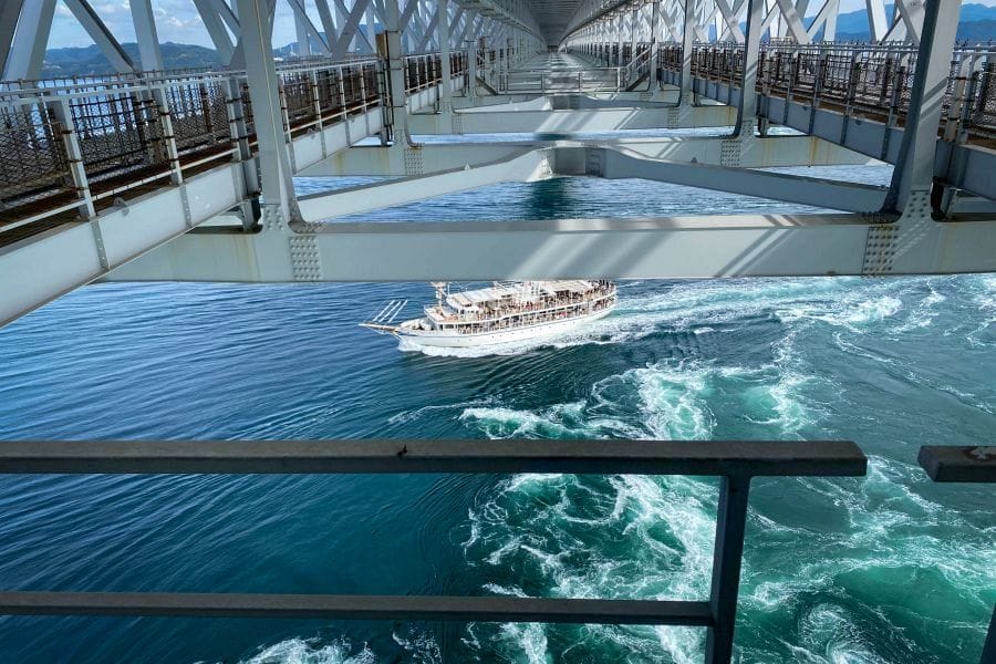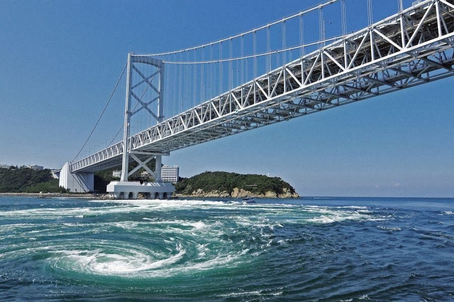 The small town of Naruto faces the island of Awaji across the Naruto Strait, which is spanned by a huge suspension bridge. The unique topology of the Seto Inland Sea causes huge whirlpools to appear in the Strait under the bridge. You can take a boat ride out to experience the phenomenon directly, or look down on it from the glass floor of the bridge called Uzunomichi.