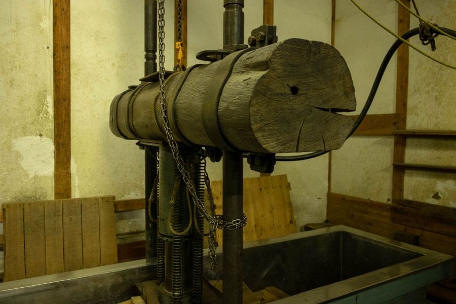 We watch the older Saitō-san filling bags with mash and laying them tidily in the _fune_ press. This is the only press of its kind we’ve seen that incorporates a big, rustic log. Even before the lid of the press is lowered, sake is dribbling out of the bags and into a collecting tank. It takes two to three days to press one batch.