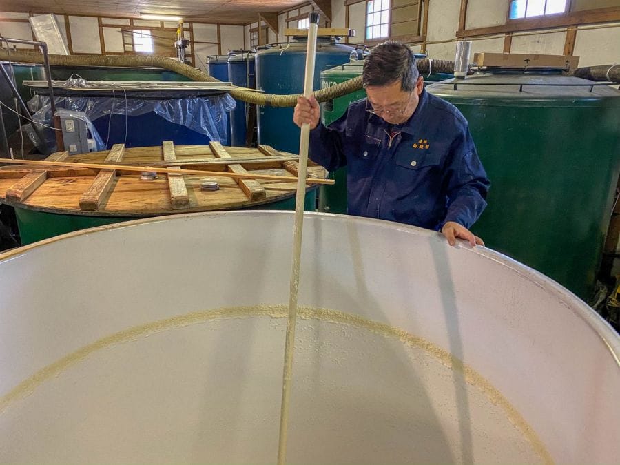 In the brewing area itself, there are rows of tanks in the high-ceilinged warehouse. Saitō-san invites me to climb a ladder to peer into a tank of junmai daiginjō mash from which emerges a delightful green apple aroma. It’s been brewing for five days. Another tank is making an audible bubbling sound and the aroma brings a smile to everyone’s faces. Many of the tanks are unused – with the growing popularity of ginjō and unpasteurised nihonshu, the sake is matured in bottles at an offsite refrigerated facility.