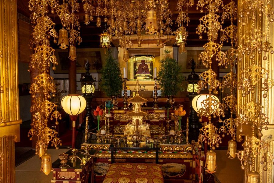 To the left is a washbasin, belfry and the temple office. There’s a Shintō shrine, and statues of Kannon and Jizō. From the temple office, a building extends to the Main Hall.
