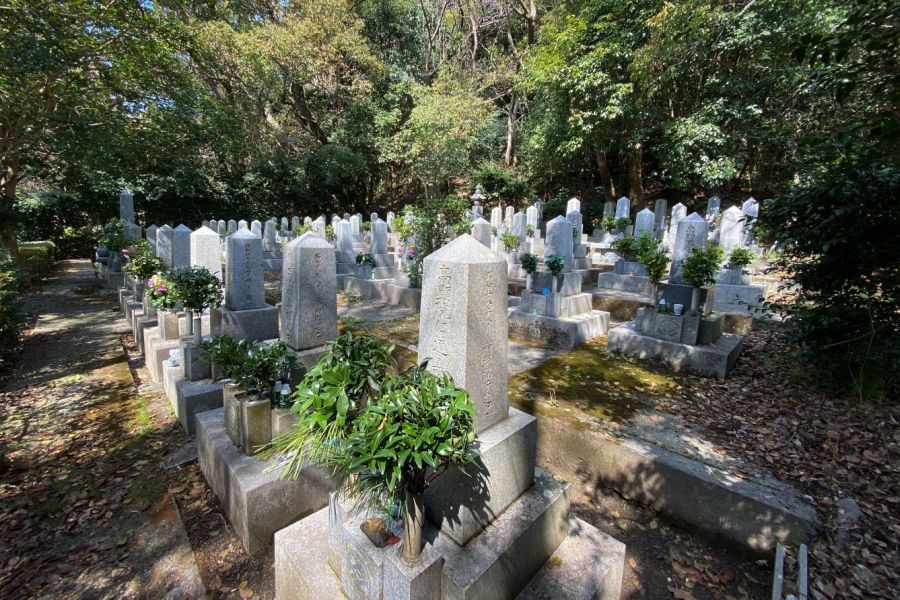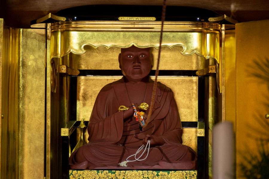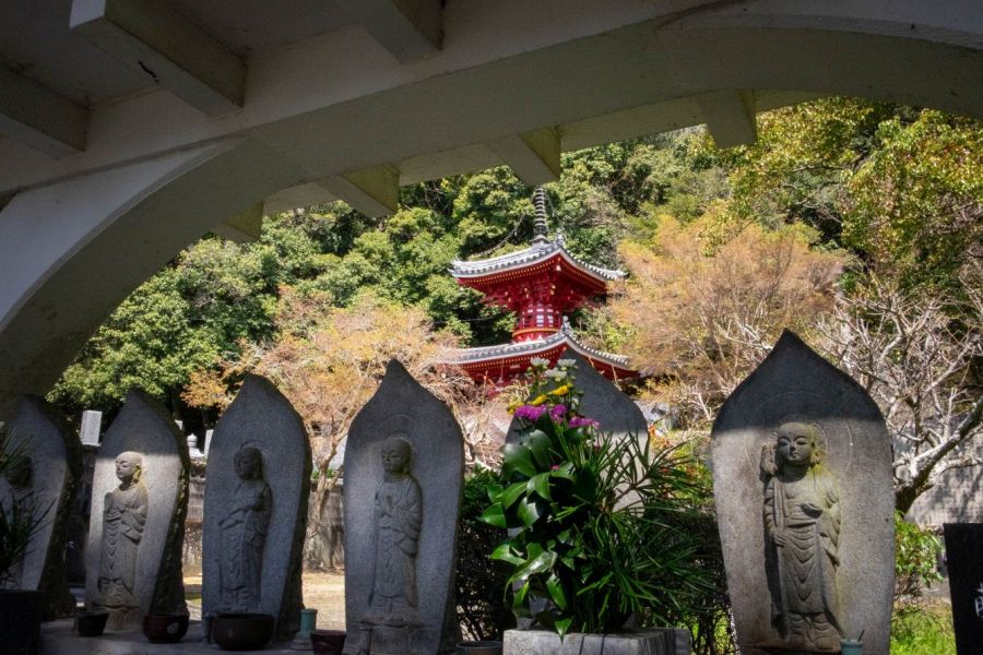Next to the Daishi Hall is a garden and pond with a lovely statue of Benten playing a lute. From here you can see the red, two-storey pagoda. In front of the pagoda is a large stone under a white canopy. This marks the grave of Chōkei, emperor of the Southern Court in the 14th century. The path going past the garden leads to a WWII cemetery.