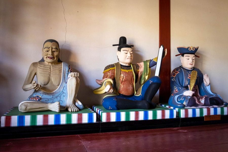 On the right of the plaza is a hexagonal Kannon Hall on a little hill and the Daishi Hall, which you can enter from the side. Inside is a seated figure of Kūkai and some pictures showing scenes from his life. If you head between the Kannondo and Daishido the red and white building on the left houses some lifelike statues of Enma, judge of Hell, and his attendants. Truly, they appear to be a hanging jury. The building on the right houses the well from which the temple takes its name.