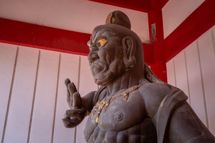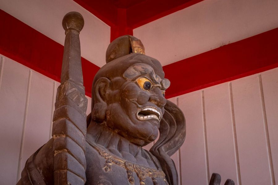 From the approach, little can be seen of the temple apart from an imposing red and white two-storey gate, with dark grey and gold guardians. Beyond the gate is a broad plaza. There’s lots to see at this temple.