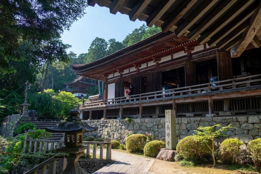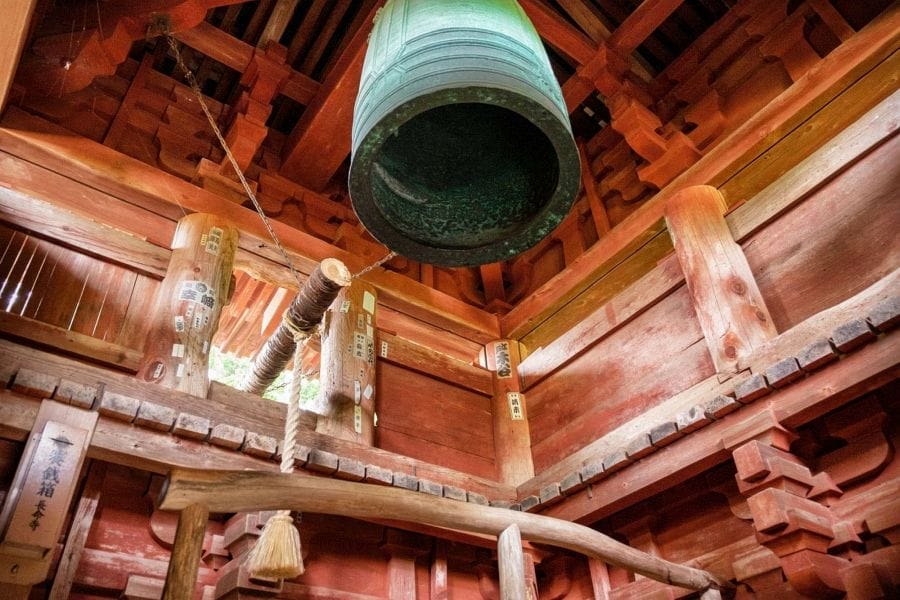 At the top of the steps, the path brings you out beside the main hall. The principal buildings are arranged across the slope. The main hall faces south, while to the right stand the Goma-dō and a three-storey pagoda. On the left are the Sanbutsu-dō, the Gohō Gongensha, and the belfry. You can climb into the belfry, which offers an excellent vantage point over the main hall and pagoda. The roof of the main hall is finished in cypress or wooden shingles, adding to the temple’s traditional appearance.