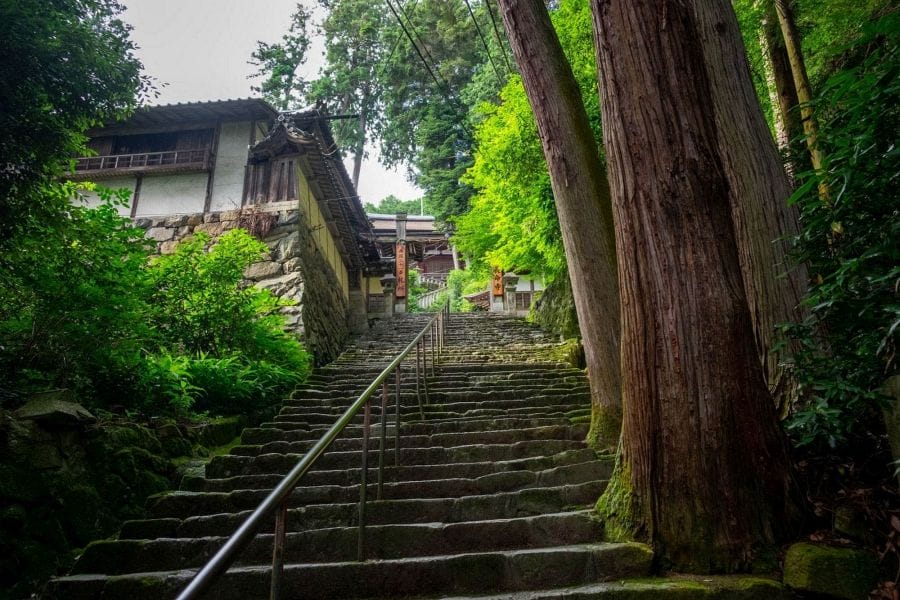 Chōmei-ji is a Tendai Buddhist temple set on the southwestern slope of Mt. Chōmeiji, within the municipality of Ōmihachiman. The temple precincts sit at around 240 metres above sea level and are reached by climbing 808 stone steps from the base of the mountain. The ascent takes roughly twenty minutes at a steady pace and is demanding in places, but the scenery and sense of arrival make it a rewarding walk. There’s also a road leading partway up the mountain, although even from the car park you still need to tackle a short but steep flight of steps.