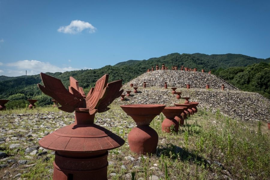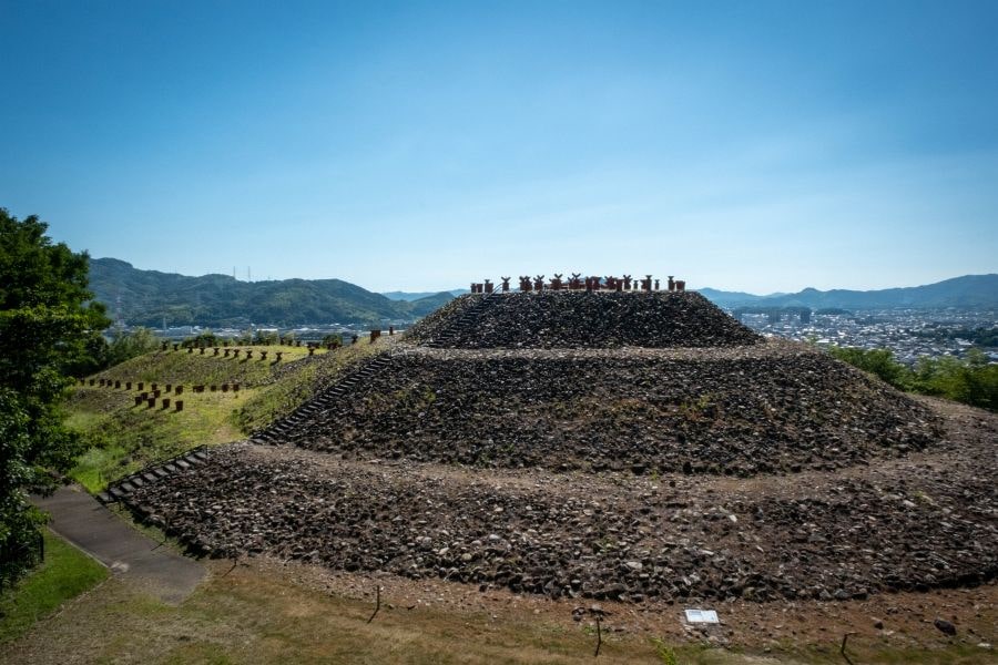 A short distance from Shirakabe Street is Chausuyama Tumulus, a keyhole-shaped burial mound from the Kofun period (5 – 7 centuries) on a hillside above the city with an expansive view over the Inland Sea. The little museum nearby houses artifacts found inside the tomb, including a bronze mirror, the largest of its kind found in Japan.