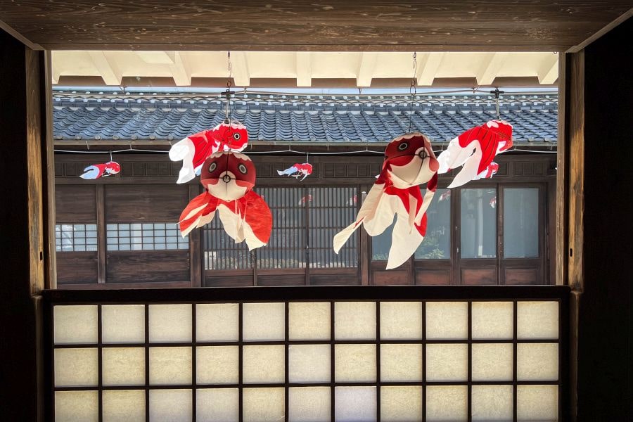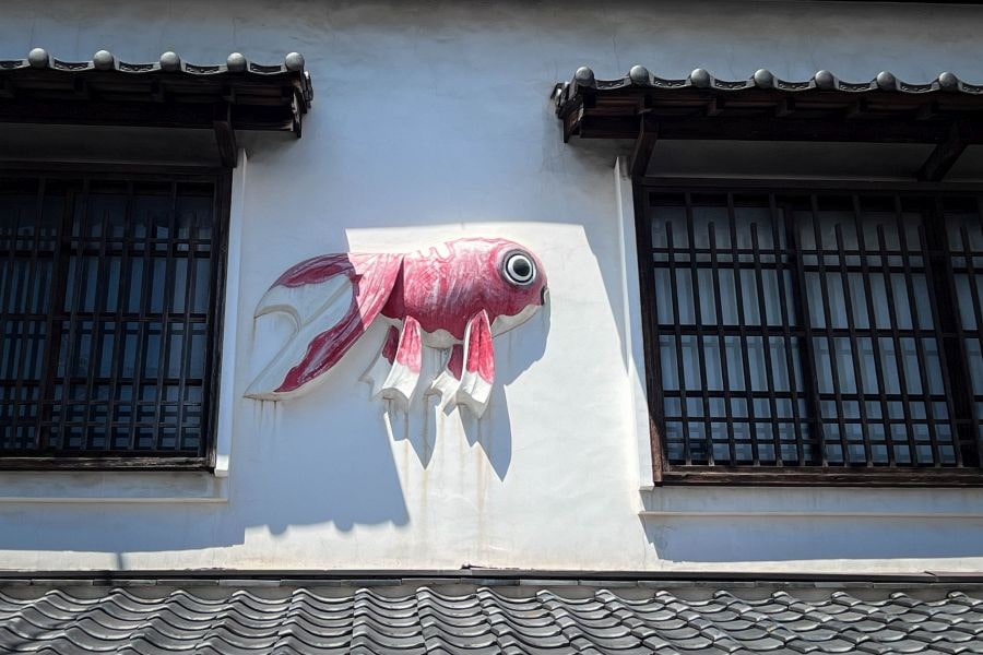 One of the unique charms of Yanai is its red and white goldfish lanterns called kingyō chōchin, made of painted washi paper on a bamboo frame. They’re particularly beautiful when illuminated at night. During the Kingyō Festival held every August 13th, the main street is hung with over 4,000 lanterns, and large goldfish-shaped floats parade through the town with traditional dances.
