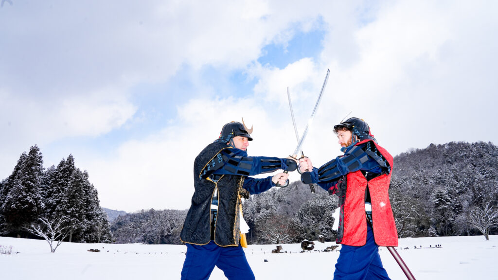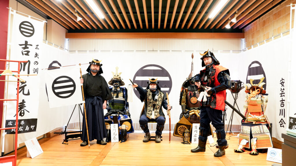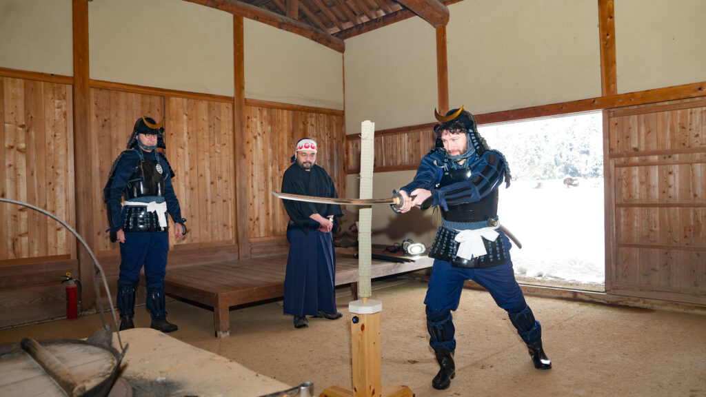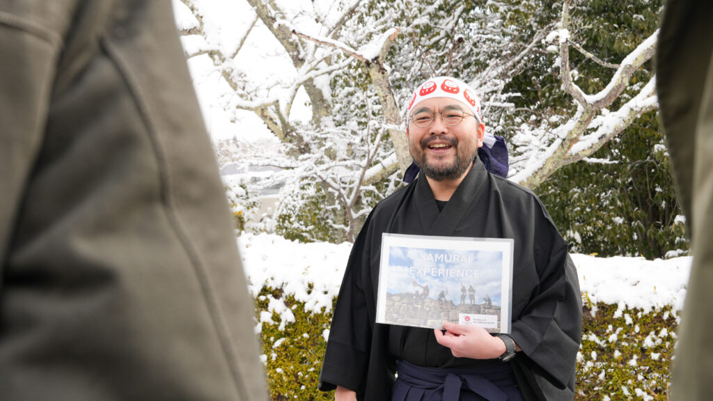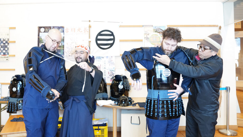 • Samurai experience begins (armor dressing, katana training, and Tameshigiri test cutting). Train at the Historic Site Kikkawa Motoharukan Ruins.