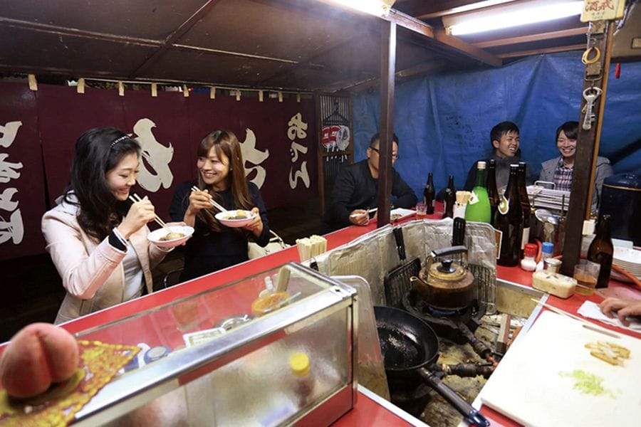 The next day you cross the Seto Inland Sea by ferry to Kure. Here, you experience sake brewing and culinary traditions rooted in soft water, which yields a gentle, delicate flavour. On the sake brewery visit, you see how differences in water affect sake’s aroma and mouthfeel through direct tasting comparisons. In the evening, we guide you through Kure’s iconic food stall district. In this port town, workers gather at stalls after work to casually enjoy drinks and food.